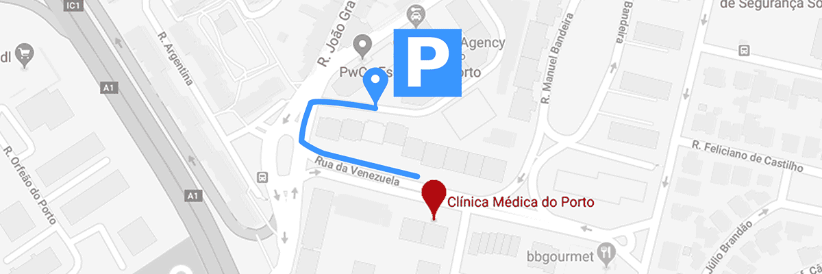 vira à sua direita na esquina onde está situado o restaurante “MacDonalds” e irá dar à Rotunda de Bessa-Leite. Nessa rotunda saí na 3ª saída e está na Rua da Venezuela. A Clínica Médica do Porto está sensivelmente a meio desta Rua.